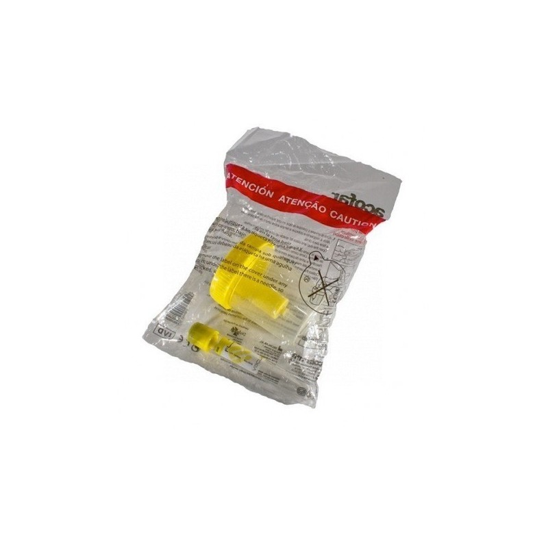 ABRA EL ENVASE Y COLOQUE LA TAPA EN UNA SUPERFICIE PLANA, BOCA ARRIBA.RECOJA LA PARTE CENTRAL DE LA MICCIÓN, DESECHANDO TANTO EL PRINCIPIO COMO EL FINAL DE LA ORINA. LLENE COMO MÁXIMO LA MITAD DEL ENVASE.CIERRE EL ENVASE CON PRECAUCIÓN PARA NO TOCAR EL INTERIOR DE LA TAPA.LEVANTE LA ETIQUETA DE LA TAPA E INTRODUZCA EL TUBO CON EL TAPÓN BOCA ABAJO, PRESIONE HASTA QUE SE LLENE EL TUBO. ETIQUETE D ENUEVO EL ORIFICIO.ENTREGUE EL ENVASE Y EL/LOS TUBO/S AL PERSONAL SANITARIO COMPETENTE.NO RETIRE LA ETIQUETA SITUADA EN LA TABA BAJO NINGÚN CONCEPTO, BAJO LA ETIQUETA HAY UNA AGUJA Y PODRÍA PINCHARSE.