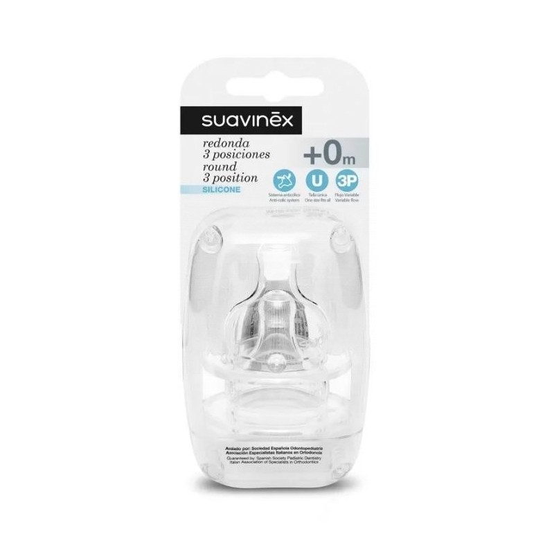 CON TETINA REDONDA 3 POSICIONES, SE ADAPTA A LA NECESIDAD DEL BEBÉ Y AL TIPO DE ALIMENTO YA QUE, TAN SÓLO GIRANDO EL BIBERÓN, PERMITE REGULAR LA INTENSIDAD DE LA SALIDA DE LÍQUIDO, GARANTIZANDO UNA CORRECTA SUCCIÓN DESDE EL PRIMER DÍA.LAS VÁLVULAS ANTICÓLICO DE SU BASE EVITAN LAS MOLESTIAS, COMO EL HIPO Y LOS CÓLICOS, QUE PUEDEN DERIVARSE DE LA INGESTA DE AIRE.AVALADA POR LA SOCIEDAD ESPAÑOLA DE ODONTOPEDIATRÍA.ESPECIALMENTE PENSADA PARA LOS BIBERONES DE BOCA ANCHA DE SUAVINEX