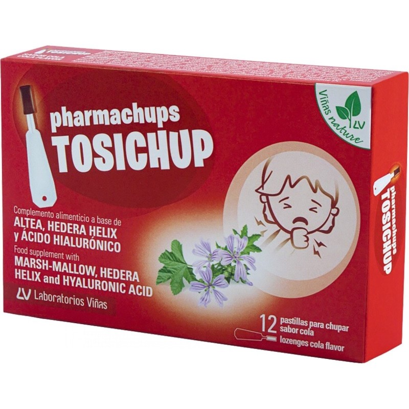 PHARMACHUPS TOSICHUP ES UN COMPLEMENTO ALIMENTICIO A BASE DE ALTEA, HEDERA HELIX Y ÁCIDO HIALURÓNICO.ESTÁ REFORZADO CON MIEL Y LIMÓN, LA RECETA TRADICIONAL PARA EL CUIDADO DE LOS MÁS PEQUEÑOS.LAS PASTILLAS PARA CHUPAR TOSICHUP AYUDAN A SUAVIZAR LA GARGANTA DE FORMA NATURAL GRACIAS AL EFECTO QUE PRODUCEN EN LA MUCOSA BUCOFARÍNGEA AL DISOLVERLAS EN LA BOCA.TOSICHUP SE PRESENTA EN FORMA DE PASTILLA PARA CHUPAR Y DISOLVER EN LA BOCA, CON UN SOPORTE PLÁSTICO PARA EVITAR QUE SE TRAGUE DE GOLPE LA PASTILLA Y CONSEGUIR QUE AL SUCCIONARLA ACTÚE LENTAMENTE.SU FORMATO EN UNA DIVERTIDA PIRULETA Y SU SABOR A COLA FACILITA LA TOMA DEL PRODUCTO A LOS MÁS PEQUEÑOS.CHUPAR LA PASTILLA HASTA QUE SE DISUELVA COMPLETAMENTE EN LA BOCA SIN TRAGARLA DE GOLPE. SE RECOMIENDA 3 PASTILLAS AL DÍA. NO RECOMENDADO EN NIÑOS MENORES DE 3 AÑOS. NO SUPERAR LA DOSIS RECOMENDADA.LOS COMPLEMENTOS ALIMENTICIOS NO DEBEN UTILIZARSE COMO SUSTITUTO DE UNA DIETA VARIADA Y EQUILIBRADA NI DE UN ESTILO DE VIDA SALUDABLE. ES IMPORTANTE QUE TODOS LOS CONSUMIDORES, Y EN PARTICULAR LOS NIÑOS Y ADOLESCENTES, SIGAN UNA ALIMENTACIÓN EQUILIBRADA Y SANA QUE PROPORCIONE LOS NUTRIENTES NECESARIOS PARA EL FUNCIONAMIENTO Y CRECIMIENTO NORMAL DEL ORGANISMO.MANTENER FUERA DEL ALCANCE DE LOS NIÑOS MÁS PEQUEÑOS.UN CONSUMO EXCESIVO PUEDE PRODUCIR EFECTOS LAXANTES.CONSERVACIÓNCONSERVAR EN LUGAR FRESCO Y SECO.